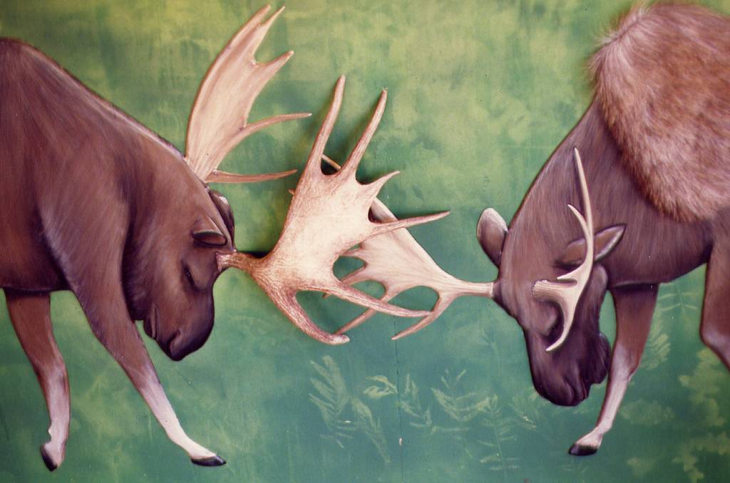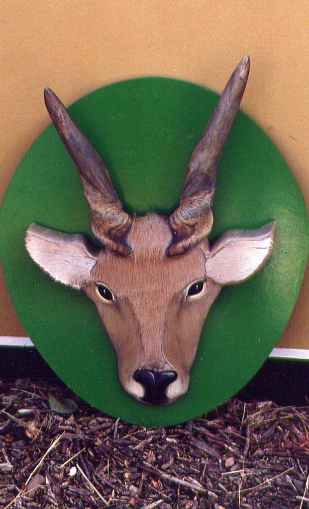 I was asked to make an interactive exhibit using a hybrid-taxidermy approach. The idea was to have the visitors experience touching authentic horns and fur in a friendly setting. The real animal parts are permanently mounted to contour-cut plywood, which I painted in a realistic style. On these panels, one horn is real and the other is trompe l'oeil style painting. These were mounted on a semi-sheltered outdoor wall, which I painted using local foliage for stencils.