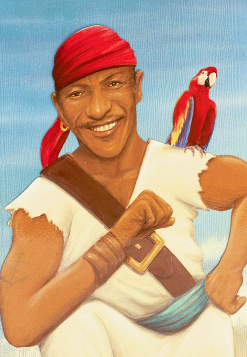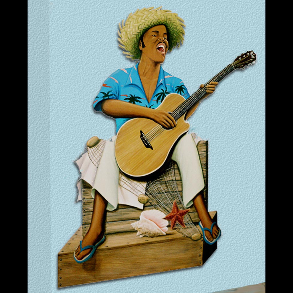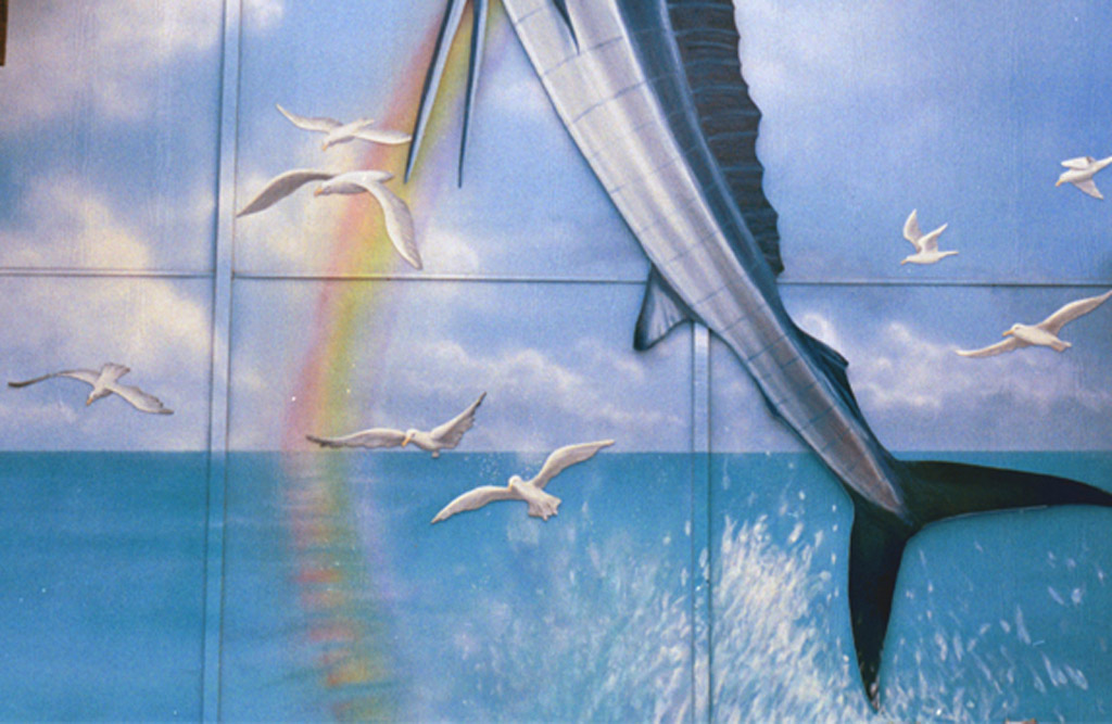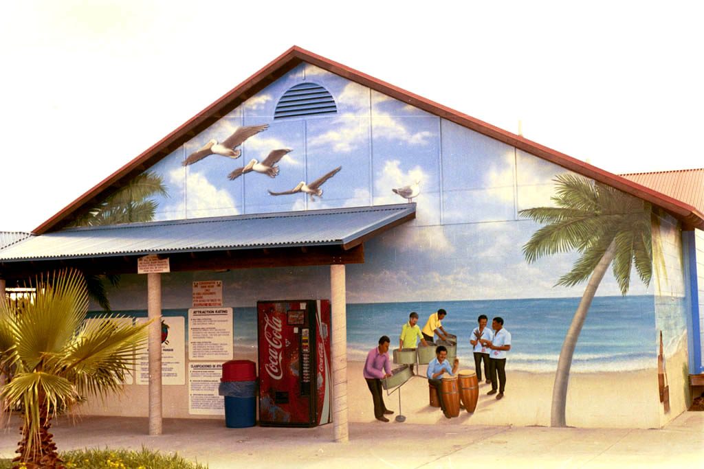 This job was a set of outdoor murals for the Bahama Beach Club Aquatics Center, which was part of the Thurgood Marshall Recreation Center. It was a Public Art project for the City of Dallas in 2005. It covered all sides of two buildings, including the outdoor showers, about 4200 square feet, total. It received a clear graffiti-proof aliphatic urethane coating as a finish. Notice the fine detail in all the figures. Instead of smoothing the whole wall, I made contour-cut painted figures out of thin sign aluminum, as well Dibond for the larger pieces. This worked great, especially where I had to work over wooden slats.