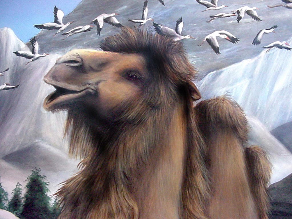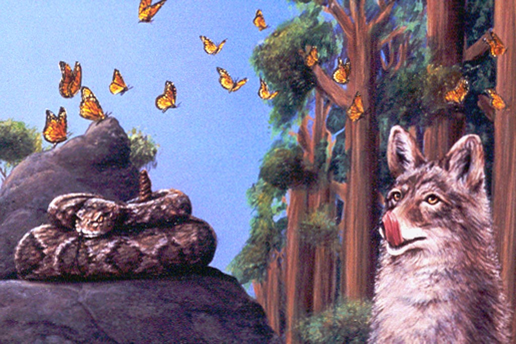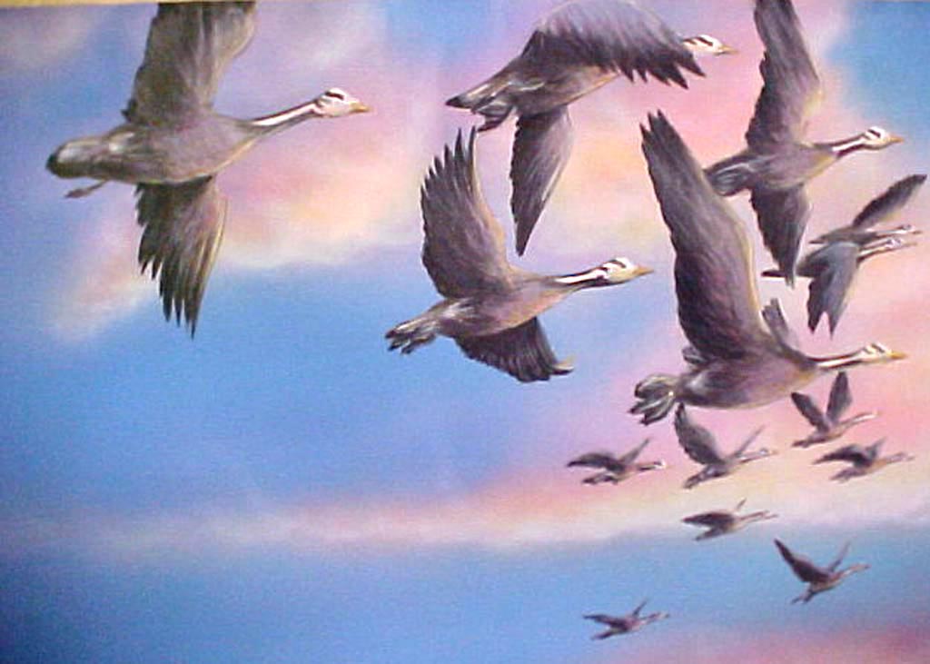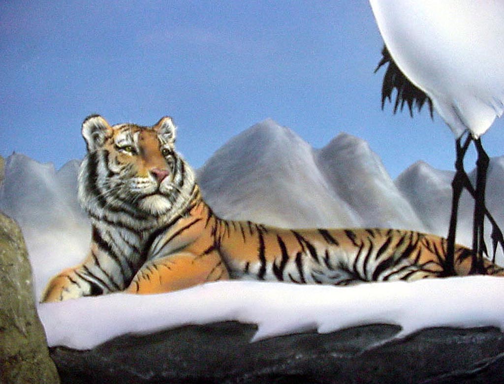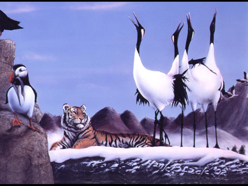 These pics are details of a 13 foot tall mural that wraps continuously around the inside of a cylindrical rotunda of the newly built Prime Meridian Restaurant (2002). The bottom is 13 feet above the floor. The skylight in the ceiling dome is a long slit that runs parallel to the equator. All the flora and fauna are positioned accordingly, with migrating birds providing a wild card for aesthetic continuity. The seasons and times of day are also represented seamlessly. 2800 square feet. This got me the prestigious Artist of the Year Award from the American Institute of Architects (AIA).