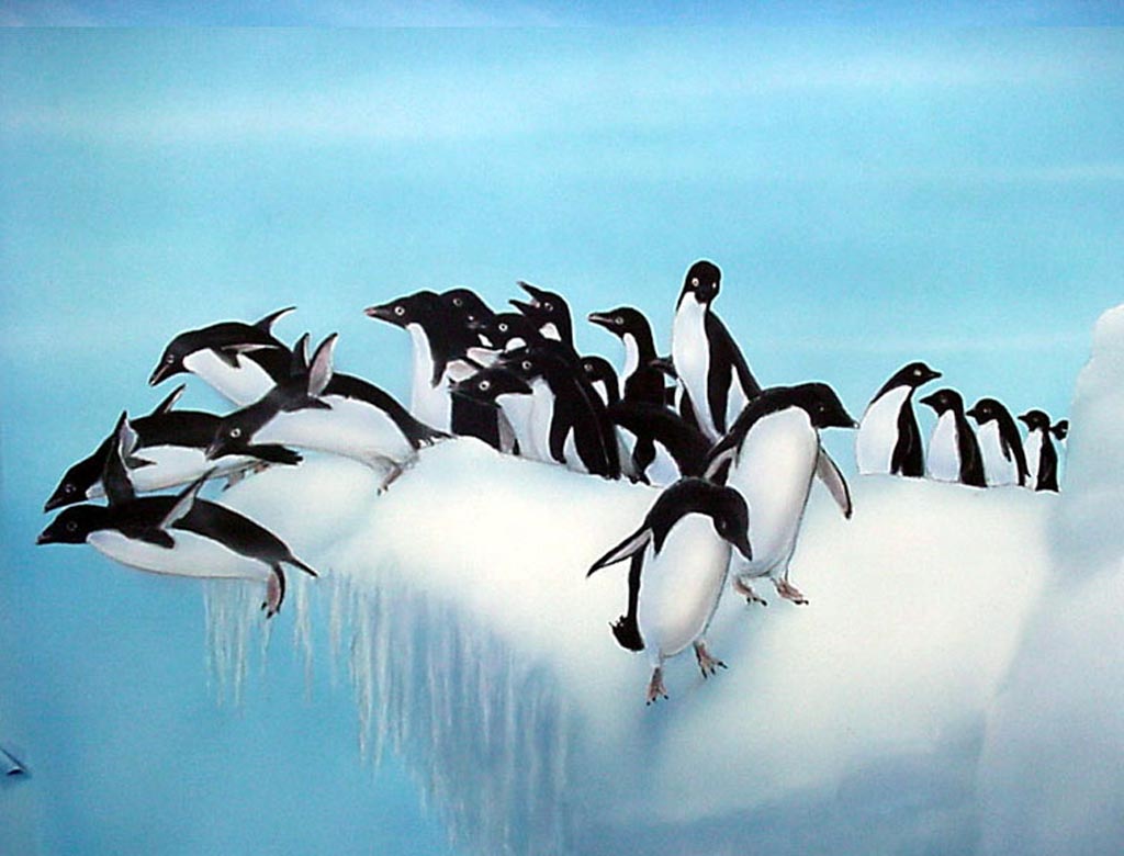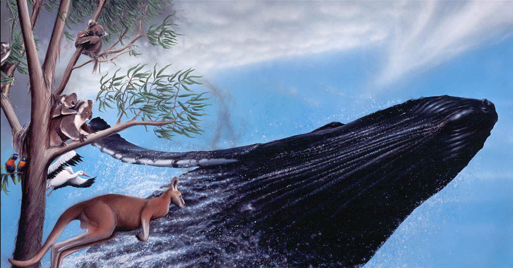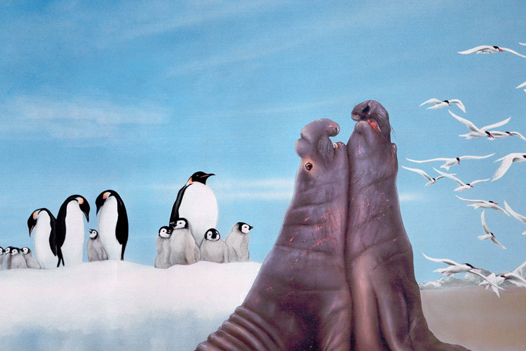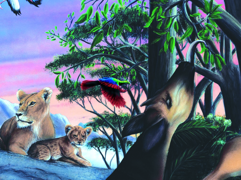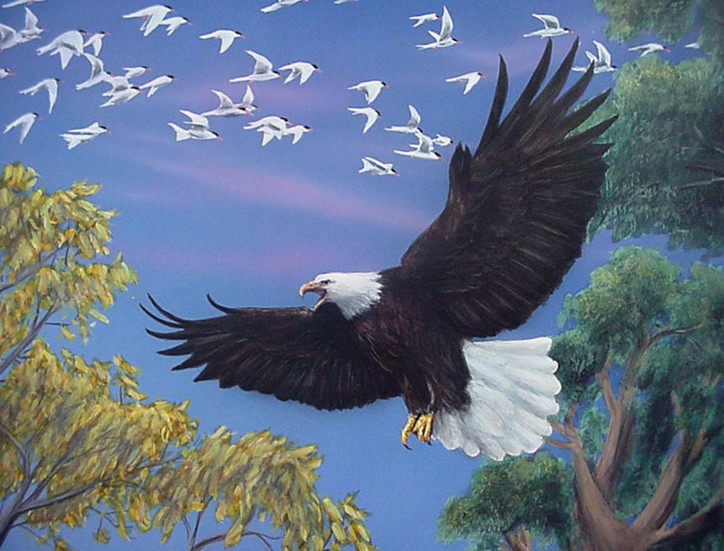 These pics are details of a 13 foot tall mural that wraps continuously around the inside of a cylindrical rotunda of the newly built Prime Meridian Restaurant (2002). The bottom is 13 feet above the floor. The skylight in the ceiling dome is a long slit that runs parallel to the equator. All the flora and fauna are positioned accordingly, with migrating birds providing a wild card for aesthetic continuity. The seasons and times of day are also represented seamlessly. 2800 square feet. This got me the prestigious Artist of the Year Award from the American Institute of Architects (AIA).