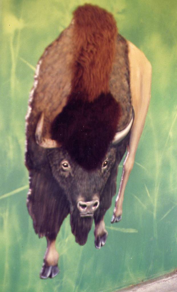 I was asked to make an interactive exhibit using a hybrid-taxidermy approach. The idea was to have the visitors experience touching authentic horns and fur in a friendly setting. The real animal parts are permanently mounted to contour-cut plywood, which I painted in a realistic style. On these panels, one horn is real and the other is trompe l'oeil style painting. These were mounted on a semi-sheltered outdoor wall, which I painted using local foliage for stencils.