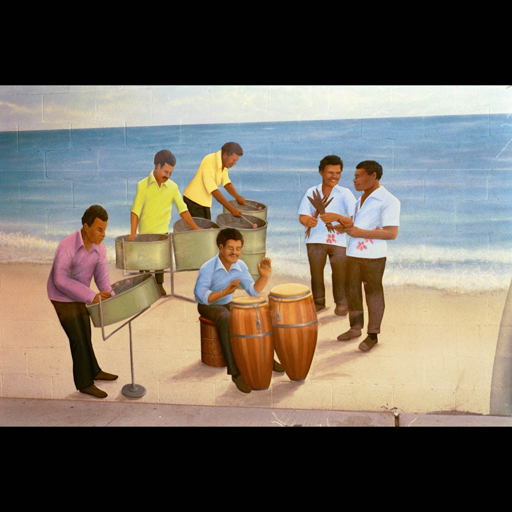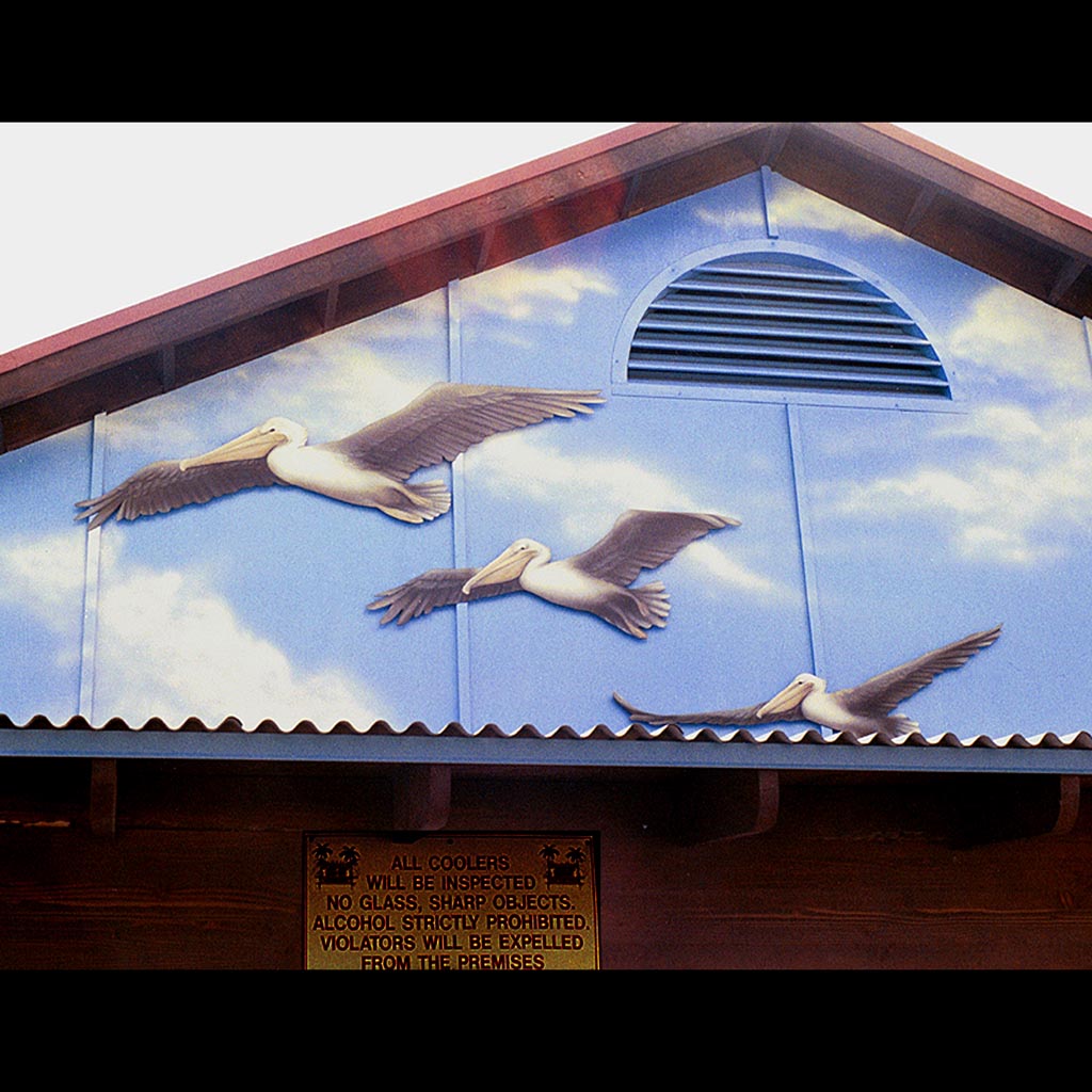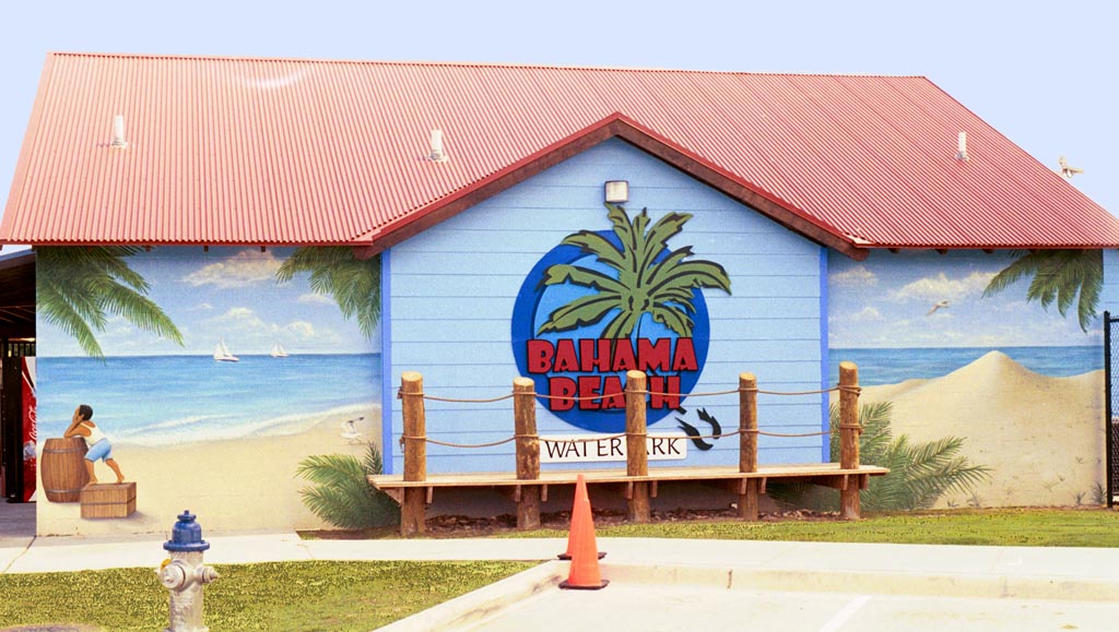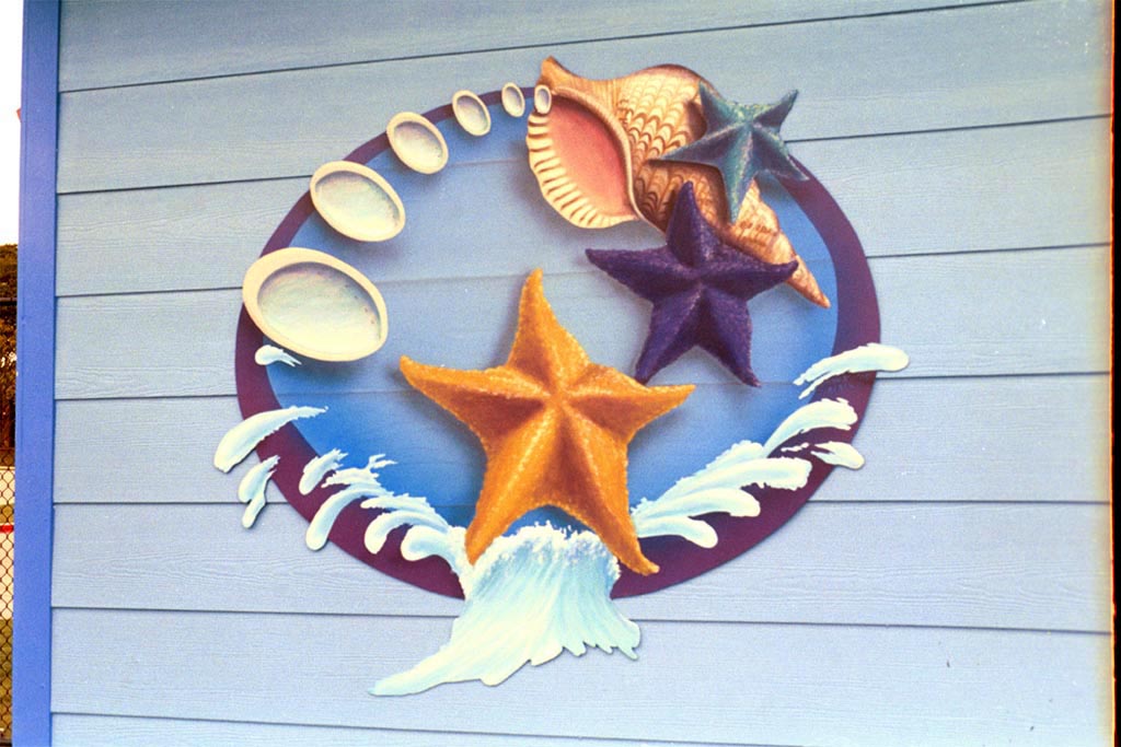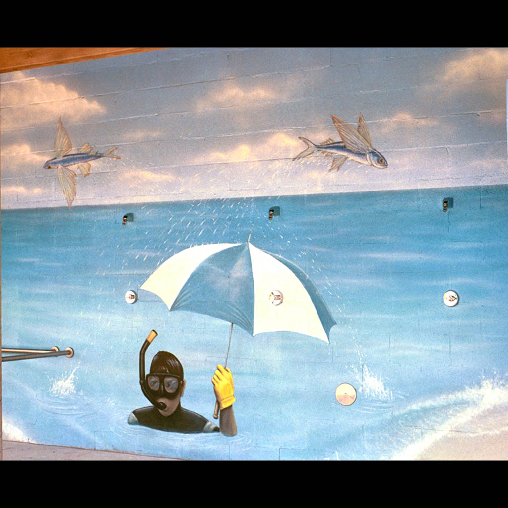 This job was a set of outdoor murals for the Bahama Beach Club Aquatics Center, which was part of the Thurgood Marshall Recreation Center. It was a Public Art project for the City of Dallas in 2005. It covered all sides of two buildings, including the outdoor showers, about 4200 square feet, total. It received a clear graffiti-proof aliphatic urethane coating as a finish. Notice the fine detail in all the figures. Instead of smoothing the whole wall, I made contour-cut painted figures out of thin sign aluminum, as well Dibond for the larger pieces. This worked great, especially where I had to work over wooden slats.
