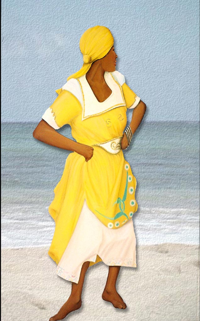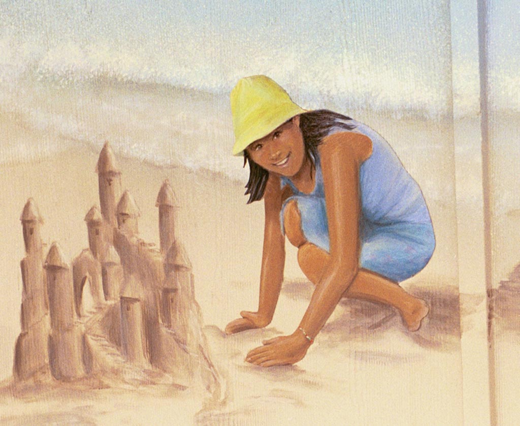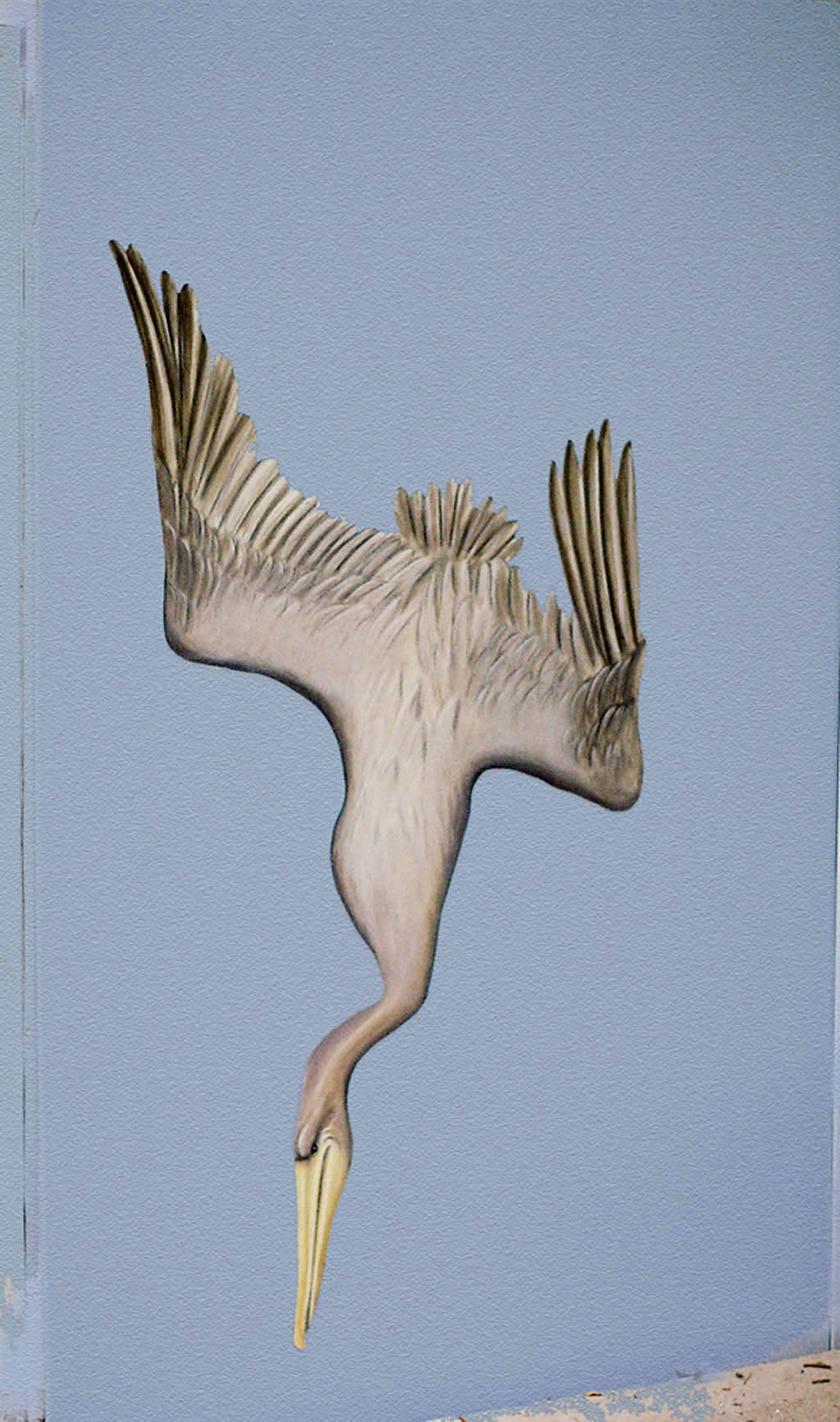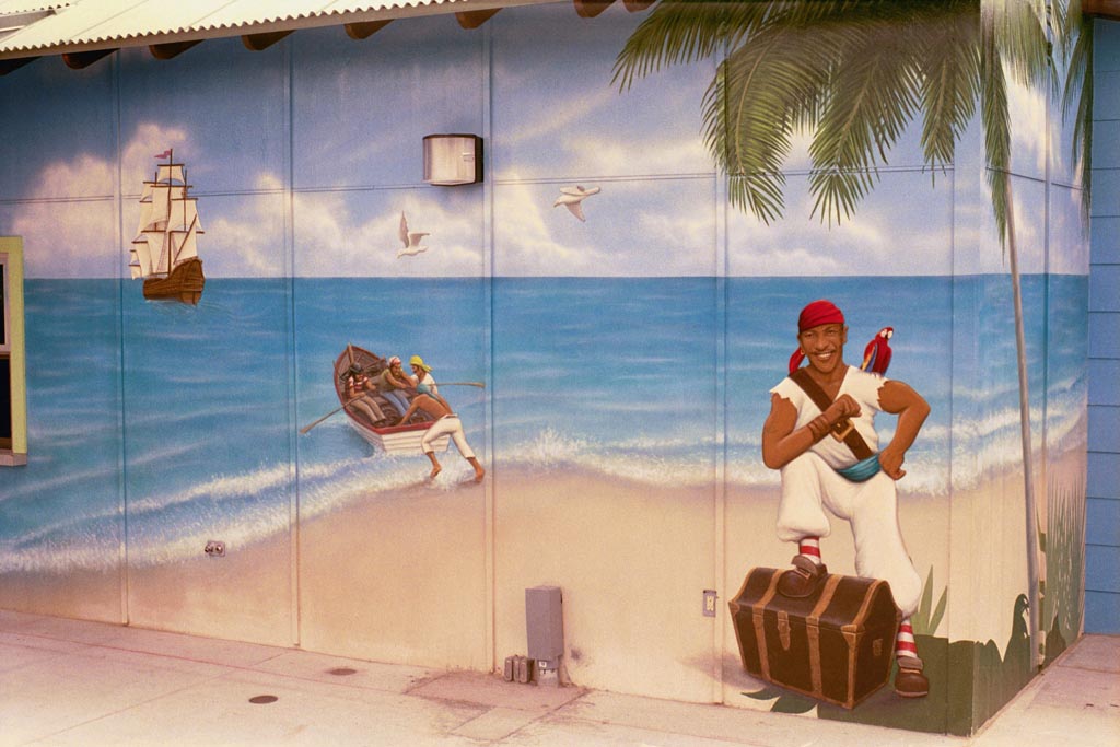 This job was a set of outdoor murals for the Bahama Beach Club Aquatics Center, which was part of the Thurgood Marshall Recreation Center. It was a Public Art project for the City of Dallas in 2005. It covered all sides of two buildings, including the outdoor showers, about 4200 square feet, total. It received a clear graffiti-proof aliphatic urethane coating as a finish. Notice the fine detail in all the figures. Instead of smoothing the whole wall, I made contour-cut painted figures out of thin sign aluminum, as well Dibond for the larger pieces. This worked great, especially where I had to work over wooden slats.