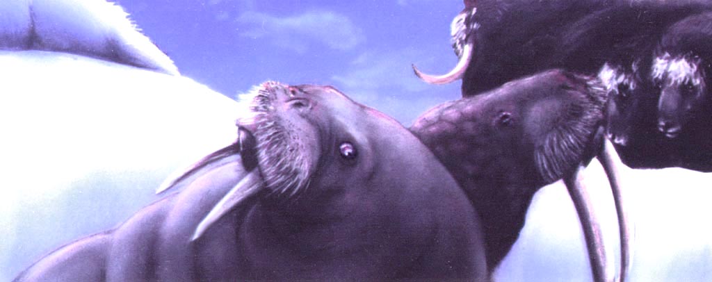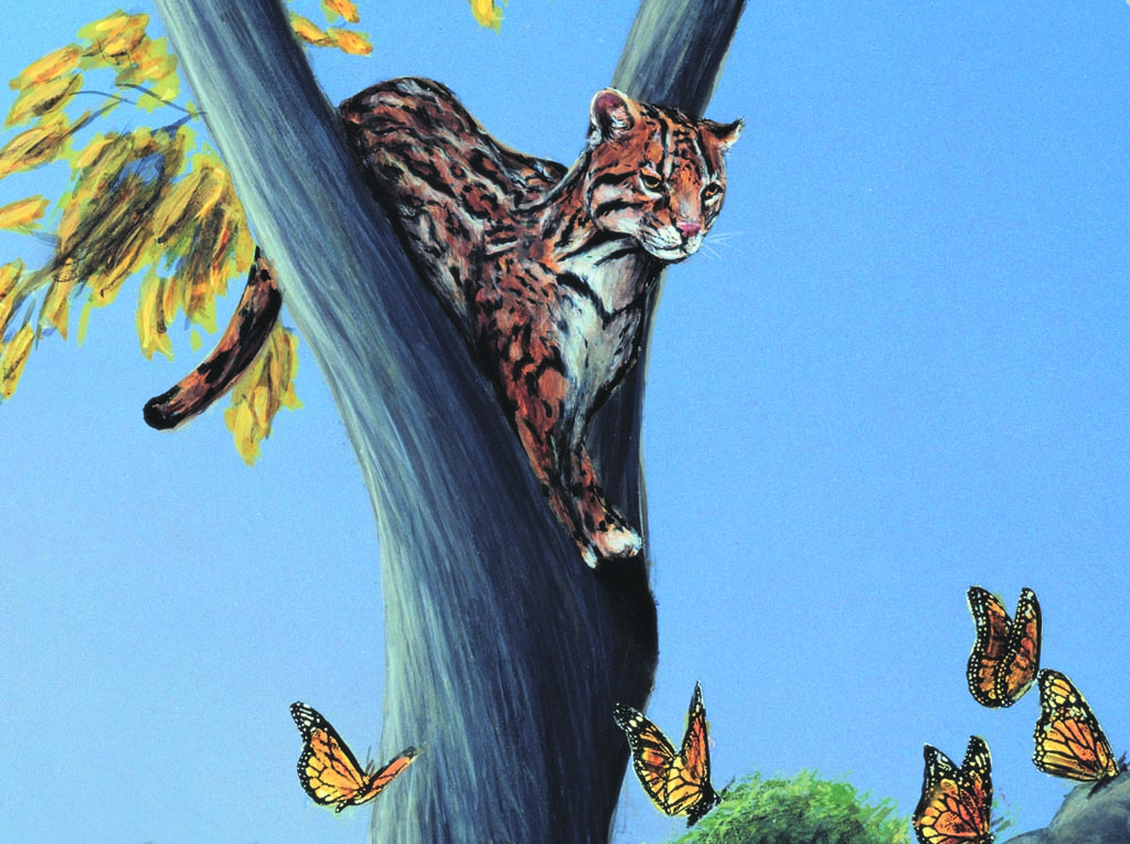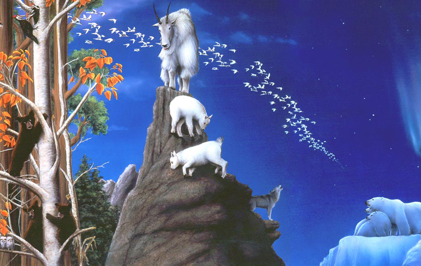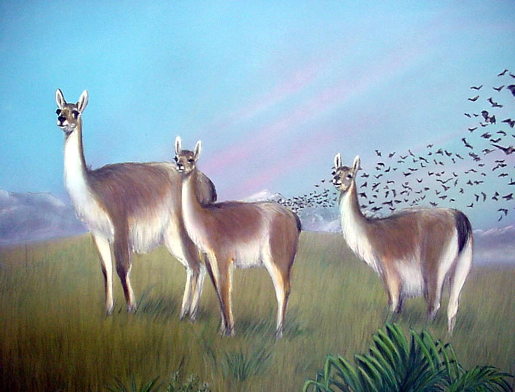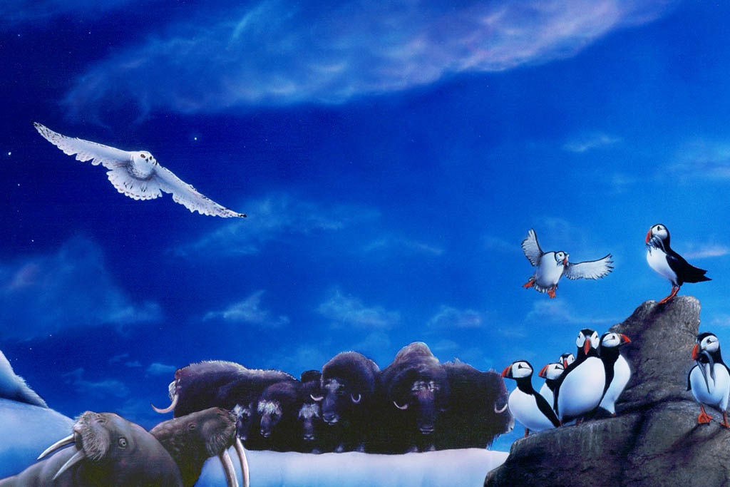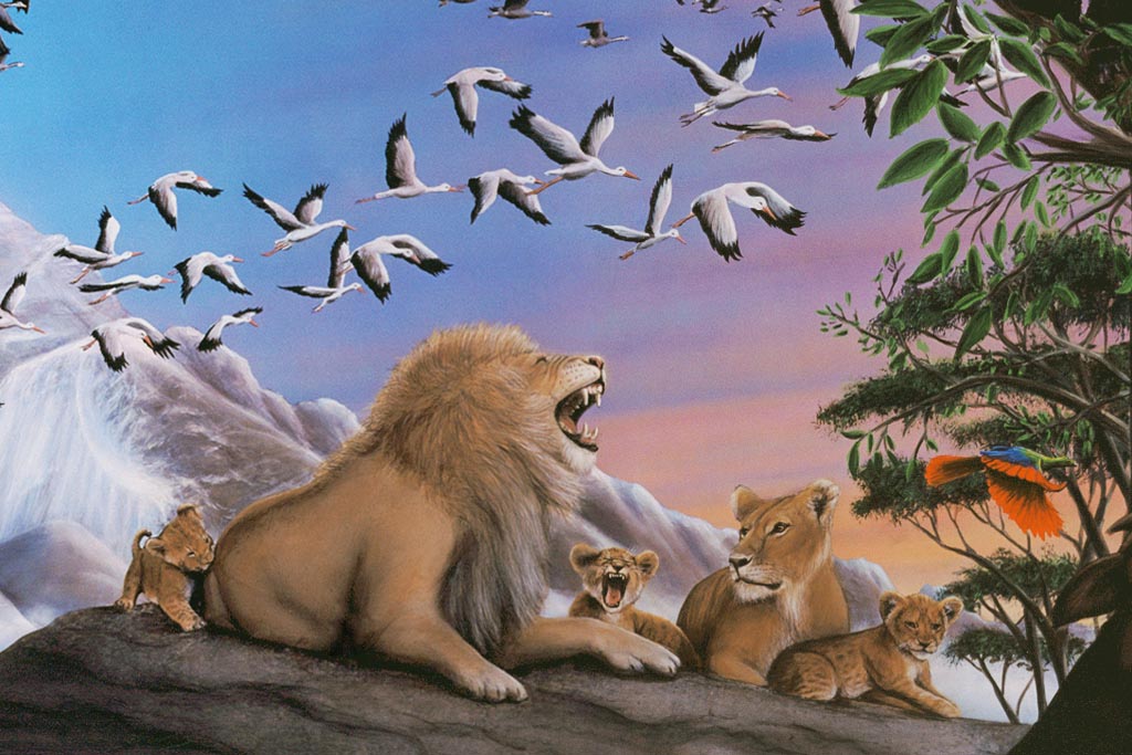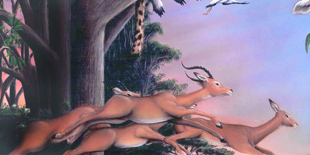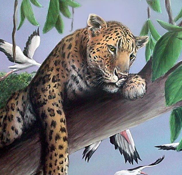 These pics are details of a 13 foot tall mural that wraps continuously around the inside of a cylindrical rotunda of the newly built Prime Meridian Restaurant (2002). The bottom is 13 feet above the floor. The skylight in the ceiling dome is a long slit that runs parallel to the equator. All the flora and fauna are positioned accordingly, with migrating birds providing a wild card for aesthetic continuity. The seasons and times of day are also represented seamlessly. 2800 square feet. This got me the prestigious Artist of the Year Award from the American Institute of Architects (AIA).